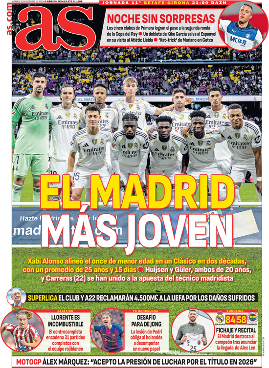 „Najmladší Real“ – píše AS, podľa ktorého Xabi Alonso postavil v El Clásicu najmladšiu jedenástku za posledných 20 rokov, s priemerným vekom 25 rokov a 15 dní. Huijsen a Güler (obaja 20) a 22-ročný Carreras sa zaradili do novej generácie, na ktorú Xabi stavia.